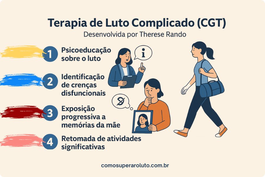 A Complicated Grief Therapy (CGT), desenvolvida por Therese Rando, combina técnicas de terapia cognitivo-comportamental e EMDR para enfrentar pensamentos disfuncionais e expor gradualmente memórias dolorosas.